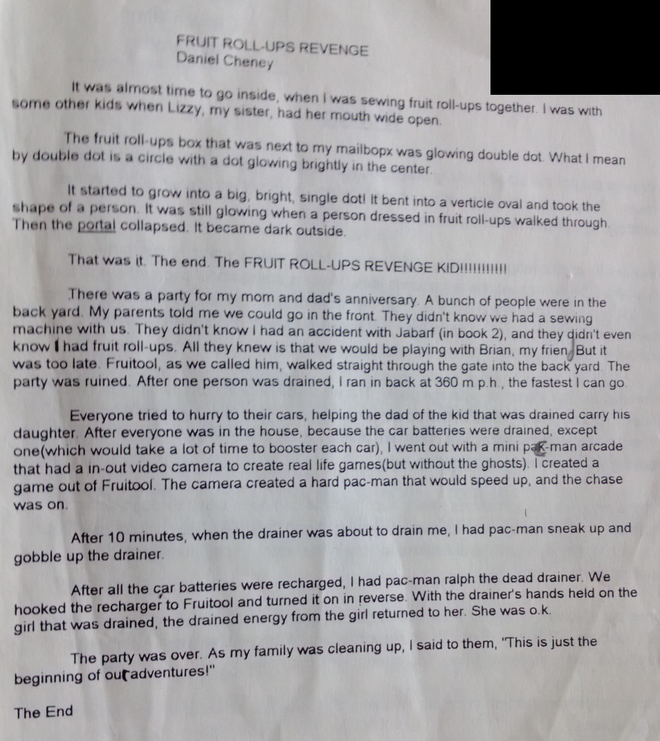 I remember very little of that day now. I know there should be a journal I wrote in as a kid inconsistenly back at my parent's place that gave a summary of the day and who the authors I listened to were. But in addition to that, all the winners had their entries collected together in a book, and each person got a copy of that book. Mine is missing pages, from the front and the back, and while half of my school's entries are gone now (since my school was the very last one arranged in the book), my entry still survived. And I just have to share it, because it's so out there.