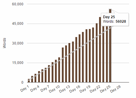 What's that? Over the 50K goal? Yep. And I'm not done with the story yet, I still have quite a bit more to write. But unlike last year, where I just wrote to the minimum goal and quit writing because of other work, I want to finish. I want to finish by the end of the month. And i want to finish with an even better milestone, having really pushed myself. Because while I said originally I wasn't going to be particularly looking at publishing this in any way (although I will be, as before, ordering myself some self-published draft copies for my collection), I have been showing this to several people as I've went along, and will show it to some more, and I want them to have a full story to read. And I want myself to have a full story to read. I still don't know what new twists may come up that i hadn't planned, like has been happening so far. So I want something rich.