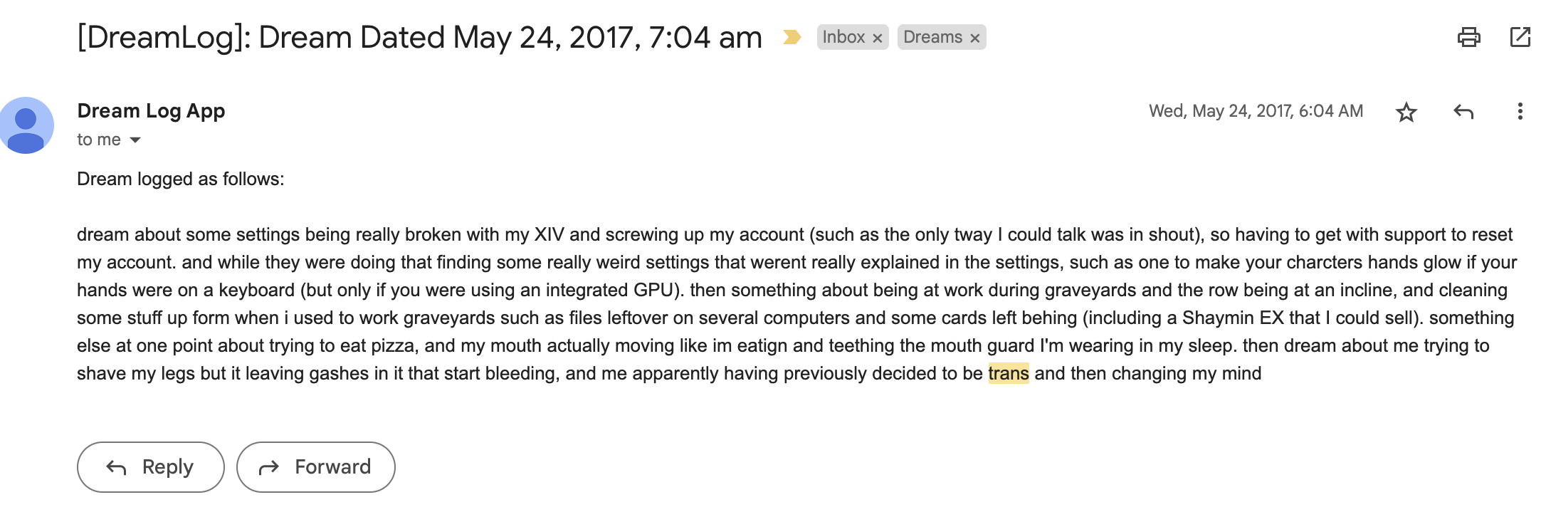And this dilemma was playing out in my head. I don't know when exactly this happened, I didn't write it anywhere, but based on the date of me telling something to a friend that happened later in the perpetual fanfic, it was either mid to late 2011, or very early 2012. So it had been a few years now since I just casually wove off the suggestion from Alice that I was trans with "nope, no gender dysphoria here". But that was thrown out the window, as this story played out. I had to admit it. I do have gender dysphoria...