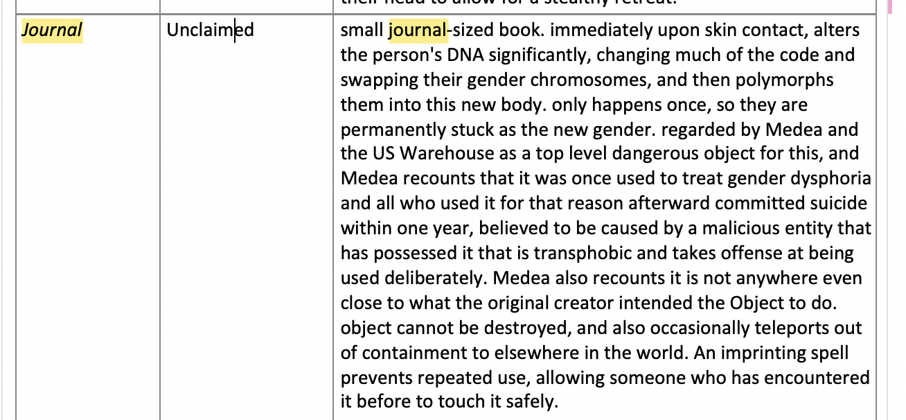 For some reason I don't recall, I had traveled back in time to around the year 1300. And over the course of me being there, Yukari ended up with some terminal illness and died. Her death would have resulted in a massive time paradox, had it not been for what happened next. I touched the most notorious magic item I've ever created in all my fiction writing, a very clearly self-transphobic magic that I created around when it was very first suggested I was trans: the Journal